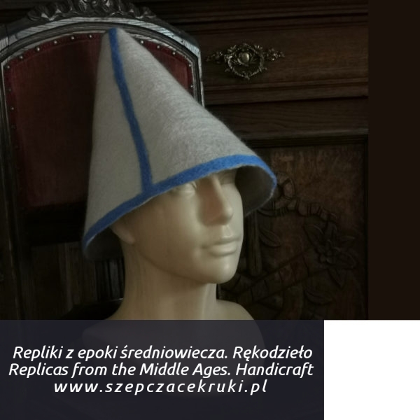 Reconstruction of a cap, 14th century. Flemish Region, Belgium. Fresco from the Leugemeete church in Ghent depicting a municipal militia. A cap made of natural wool by hand felting.